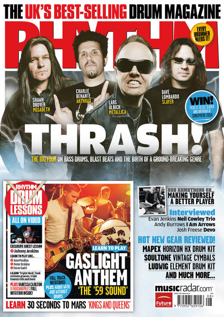 Najnowszy numer brytyjskiego czasopisma dla perkusistów „Rhythm” zawiera bardzo obszerny artykuł, w którym Joel McIver oraz Charlie Benante (Anthrax), Dave Lombardo (Slayer), Shawn Drover (Megadeth) oraz Lars Ulrich rozmawiają o thrash metalu. Historia powstania gatunku i jego odrodzenie w ostatnich latach, inspiracje muzyków, podejście do gry, wzajemna rywalizacja, bicie rekordów prędkości, Cliff Burton, stres u Larsa (?), związek thrashu z hardcore punkiem, okoliczności wymyślenia blastów – to tylko część tematów poruszonych w przetłumaczonym dla Was artykule…