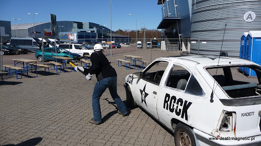 Obok hali niespodzianka – w całkiem niezłym (jeszcze) stanie stoi sobie Opel Kadett, którego zupełnie za darmo można potraktować siekierą, oczywiście po włożeniu specjalnych okularów ochronnych oraz kasku. Mało tego! Każdy uczestnik otrzymywał białą hustkę z logo ROCK, zapewne jakiegoś sponsora – całkiem fajny pomysł. Powiem tylko że byliśmy na tyle wcześnie, że samochód wyglądał super, ale pod koniec dnia gdy koncert zbliżał się już wielkimi krokami – Kadett był już totalnie zmasakrowany. Najsss!