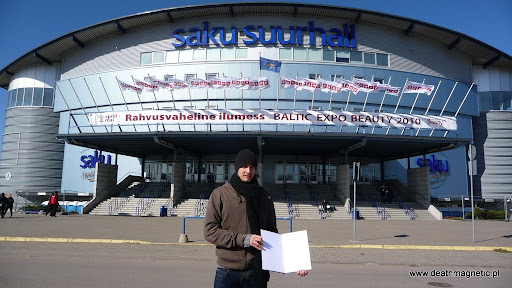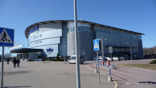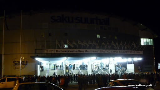 Pierwszym miejscem gdzie udało się trzech wygłodniałych facetów była oczywiście pobliska pizzeria, gdzie wykładając sporo kasy kupiliśmy sobie po olbrzymiej pizzy. Jak się okazało, zamiast 3 pizz zjedliśmy może półtorej, a całą resztę woziliśmy przez resztę dnia w pudle, by na samym końcu zostawić wszystko po prostu przed halą! Próbowaliśmy też sprawdzić, jak do jechać do Saku Suurhall (hali, w której miał się odbyć koncert) ale nawet przy użyciu Google Maps w telefonie nie było to proste, także naturalnym wyborem była taksówka. Podróż z panem pochodzącym z Rosji i mówiącym po angielsku tyle co pierwszoklasista w polskiej szkole była całkiem przyjemna, a już na pewno wesoła – facet próbował gadać o wszystkim, ale zasób jego słownictwa pozostawiał sporo do życzenia. Hala w której miał się odbyć występ znajduje się raczej na uboczu – z dworca autobusowego dotarcie tam zajęło nam trochę czasu… Salu Suurhall (Saku to producent estońskiego piwa) jest z zewnątrz całkiem spora, ale to raczej pozory. Jest to typowy obiekt mieszczący kilka tysięcy osób – z zewnątrz przypomina wielki walec z logo Saku.