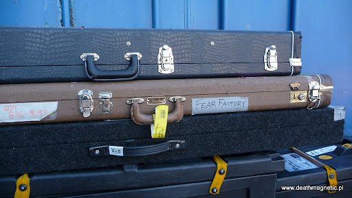 Jakby tego było mało, podczas jednej z moich samotnych wycieczek dookoła hali natknąłem się na coś, co mnie bardzo zdziwiło. Otóż przed jednym z wejść leżały instrumenty Fear Factory (!), ich wzmacniacze i cały sprzęt, popakowany tylko w skrzynie, na których na naklejkach były zapisane nazwiska właścicieli (np. Byron Stroud, Dino Cazares) itp.! Niesamowite. Prawdę mówiąc jakby ktoś chciał, to pewnie mógłby sobie na tych gitarach trochę pograć, gdyż leniwie przechadzająca się dokoła ochrona raczej nie pilnowała tego miejsca i można było robić totalnie wszystko.