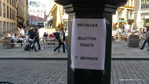 Pierwsza część pobytu w Norwegii była bardzo miłym wypoczynkiem, połączonym ze zwiedzaniem okolicznych miasteczek oraz Oslo. Jako ciekawostkę można wymienić kilka rzeczy, które można było spotkać na ulicach Oslo 12 kwietnia 2010, czyli na dzień przed koncertem w Telenor Arena. Pierwszą z nich było ogłoszenie, na które natrafiłem na ulicy – ktoś po prostu chciał sprzedać bilety – pewnie większość ludzi nigdy nie zwróciłoby na to uwagi, ale wprawne oko koncertowicza takich rzeczy nie omija 😉 Druga sprawa to ogłoszenie na Hard Rock Cafe – reklamujące tamtejsze Pre-Party (na którym niestety nie udało mi się ostatecznie pojawić) – zawierające bardzo efektowne logo norweskiego chaptera Metclubu – Norway Inc.