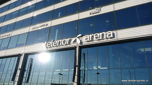 Telenor Arena robi wrażenie. Jest to duży obiekt, na którym na co dzień gra lokalna drużyna piłki nożnej (pełnowymiarowe boisko (!)). Jak się później okaże – była to zdecydowanie największa hala, jaką odwiedziłem podczas moich tegorocznych wojaży. Przed halą sporo fanów – typowych „norweskich” – czyli pełny luzik i kultura – to się oczywiście chwali. Nikt nie przepychał się do wejścia a kolejka – mimo, że całkiem długa – kurczyła się bardzo szybko. Przed halą chodziło kilku gości, którzy sprzedawali Tour Booki nosząc je w dłoniach i krzycząc o możliwości ich kupna. Osobiście nie znam norweskiego ani trochę, ale mój towarzysz Wierzba wspominał, że przechodnie kpili z nich nieco pytając, czy można płacić kartą 😉 Jako kolejną ciekawostkę można wspomnieć, że parking przy Telenor Arena był zamknięty i nie można było postawić tam samochodu – dojazd postanowiono przerzucić tylko i wyłącznie na komunikację miejską – czyli pociągi podmiejskie i autobusy dojeżdżające w okolice hali.