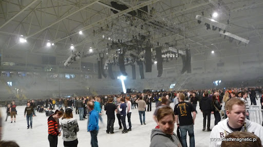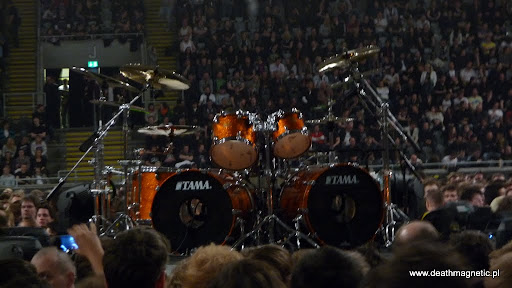 Gdy suporty skończyły, na scenie zaczęło się dziać wiele rzeczy naraz. Jak to na halowych koncertach – po drabinkach zaczęli się wspinać operatorzy świateł, którzy siedzieli pod sufitem aż do końca koncertu. Odkryto perkusję Larsa, zaczęto przyklejać set listy, strojono gitary. Atmosfera gęstniała, w pewnym momencie zaczęło się It’s a Long Way To The Top i myślałem, że za chwilę zacznie się występ Metalliki – okazało się jednak, że to była podpucha i kawałek AC/DC nie oznacza już, że za chwilę rozpocznie się The Ecstasy of Gold (szkoda). Czas mijał, trybuny zapełniły się już prawie w całości – gdy obejrzałem się za siebie – ludzie wypełniali już halę, chociaż tłoku absolutnie nie było. Możliwe, że było to spowodowane tym, że wcale nie okupowałem barierek, jak mam to zwykle w zwyczaju. Stałem w odległości kilkunastu rzędów od sceny, obserwując spokojnie, co się na niej dzieje – jeszcze przed gigiem ustaliłem ze swoim towarzyszem, że nie brniemy w tłum, a stoimy nieco dalej.
